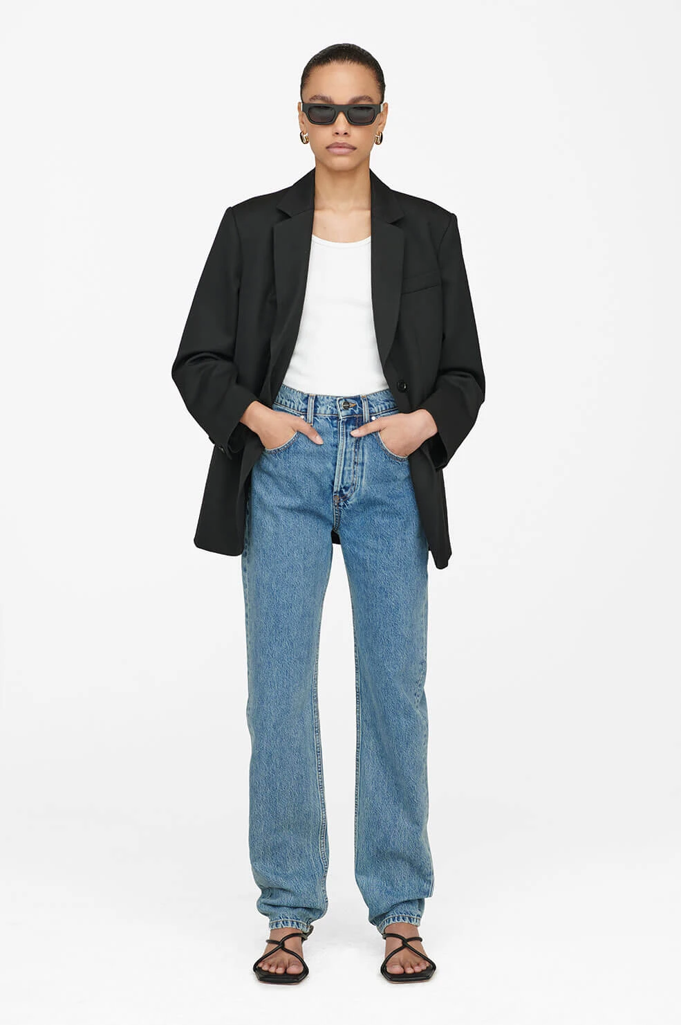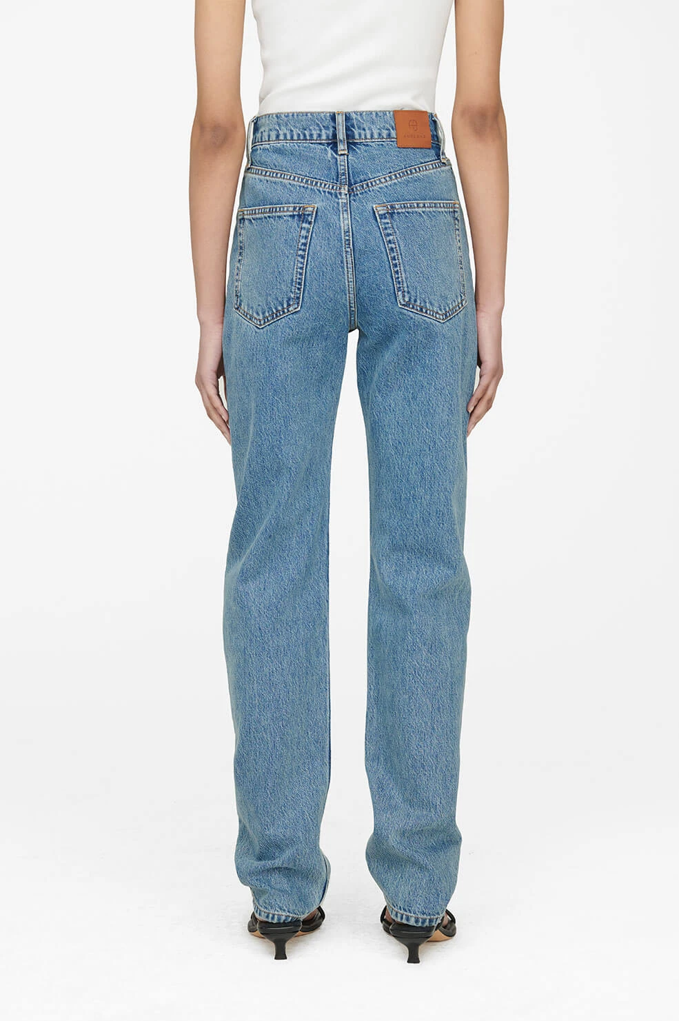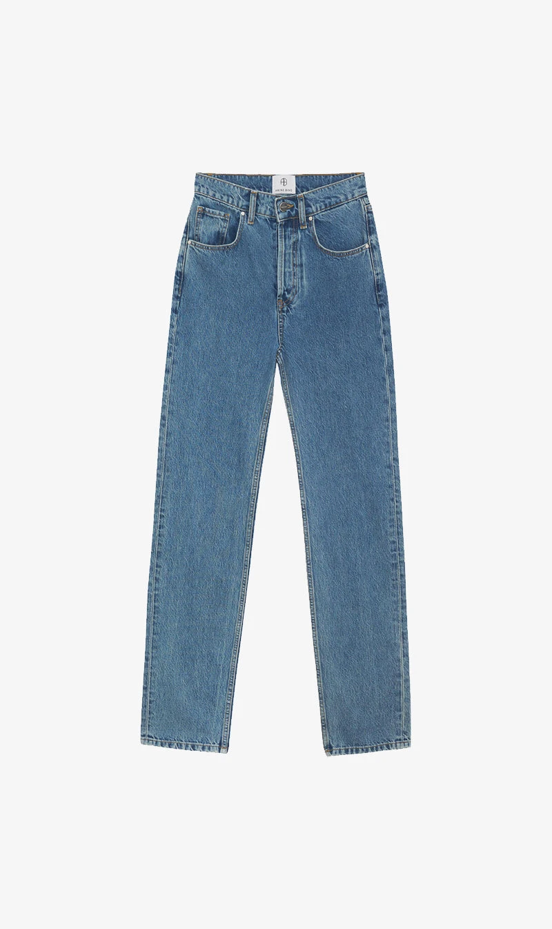 The Anine Bing Frances Jean in River Blue is a new vintage-inspired fit made from 100% rigid organic cotton denim in a clean blue wash with highs and lows throughout. This style features a high waist, slightly dropped crotch, and traditional five-pocket design.