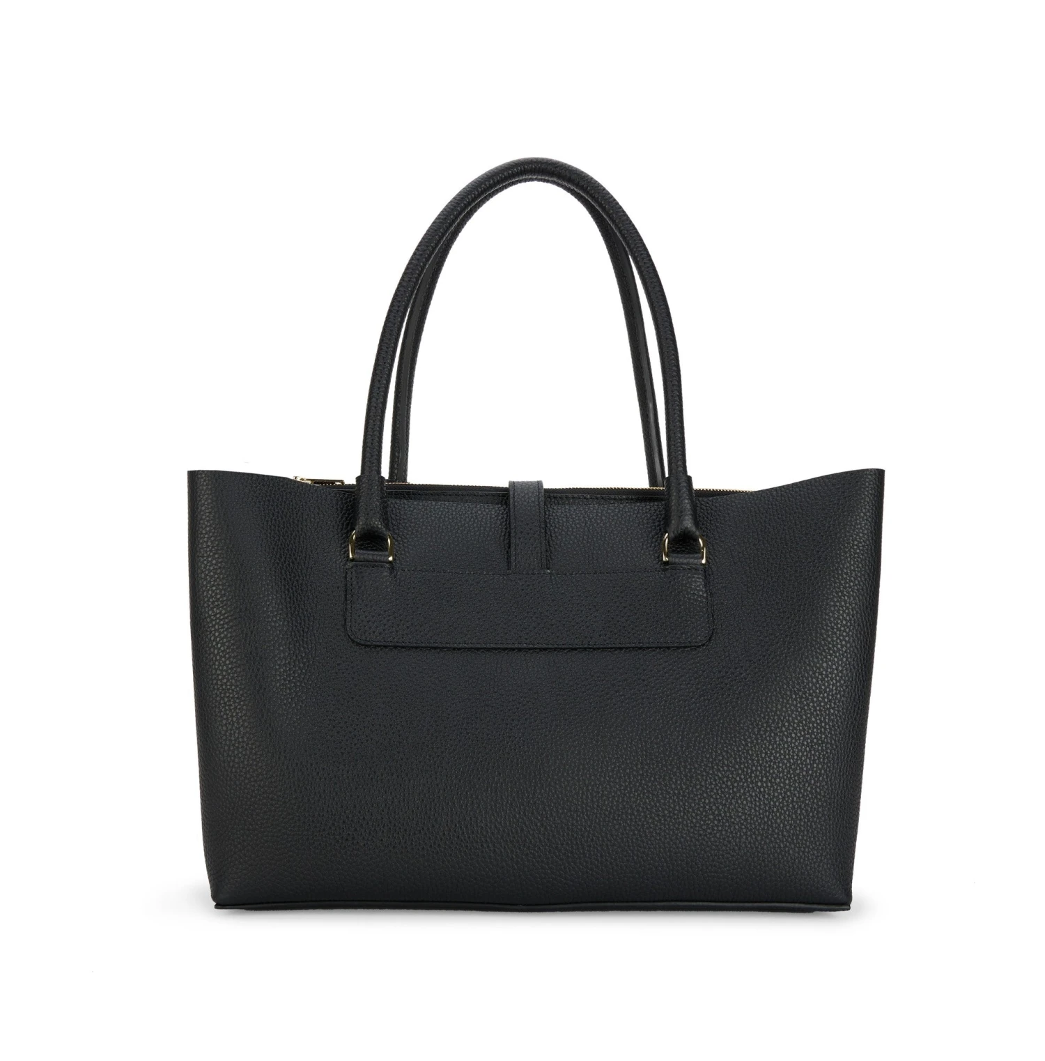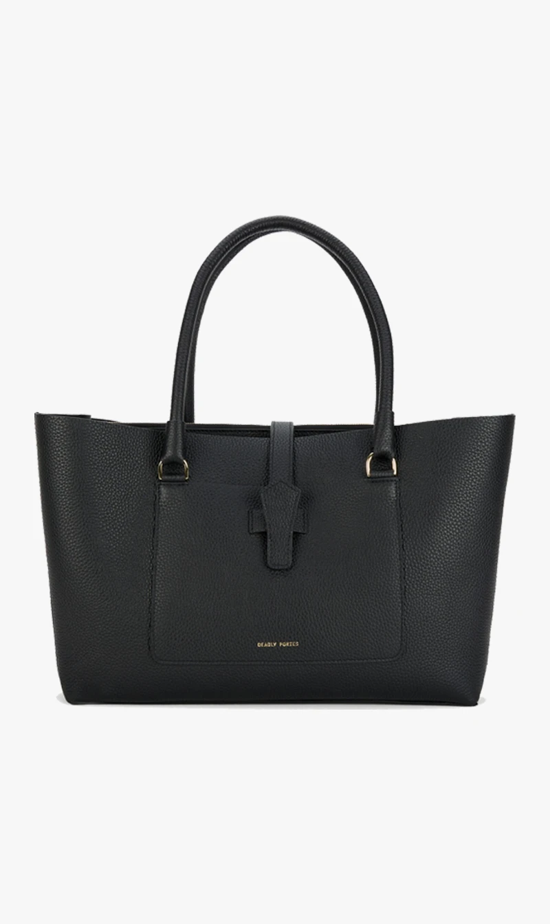 The Deadly Ponies Mr Breton in Black is the newest member of the Deadly Ponies tote family. Featuring a generous landscape silhouette, that is perfected for work and travel. Crafted with a generous zip compartment, slip pocket, and an internal card slot, that is all secured with the leather tab closure. Carry him in your hand, or on your shoulder with the dual handles. Designed to fit a 15″ laptop, making it perfect for your work and daily life.