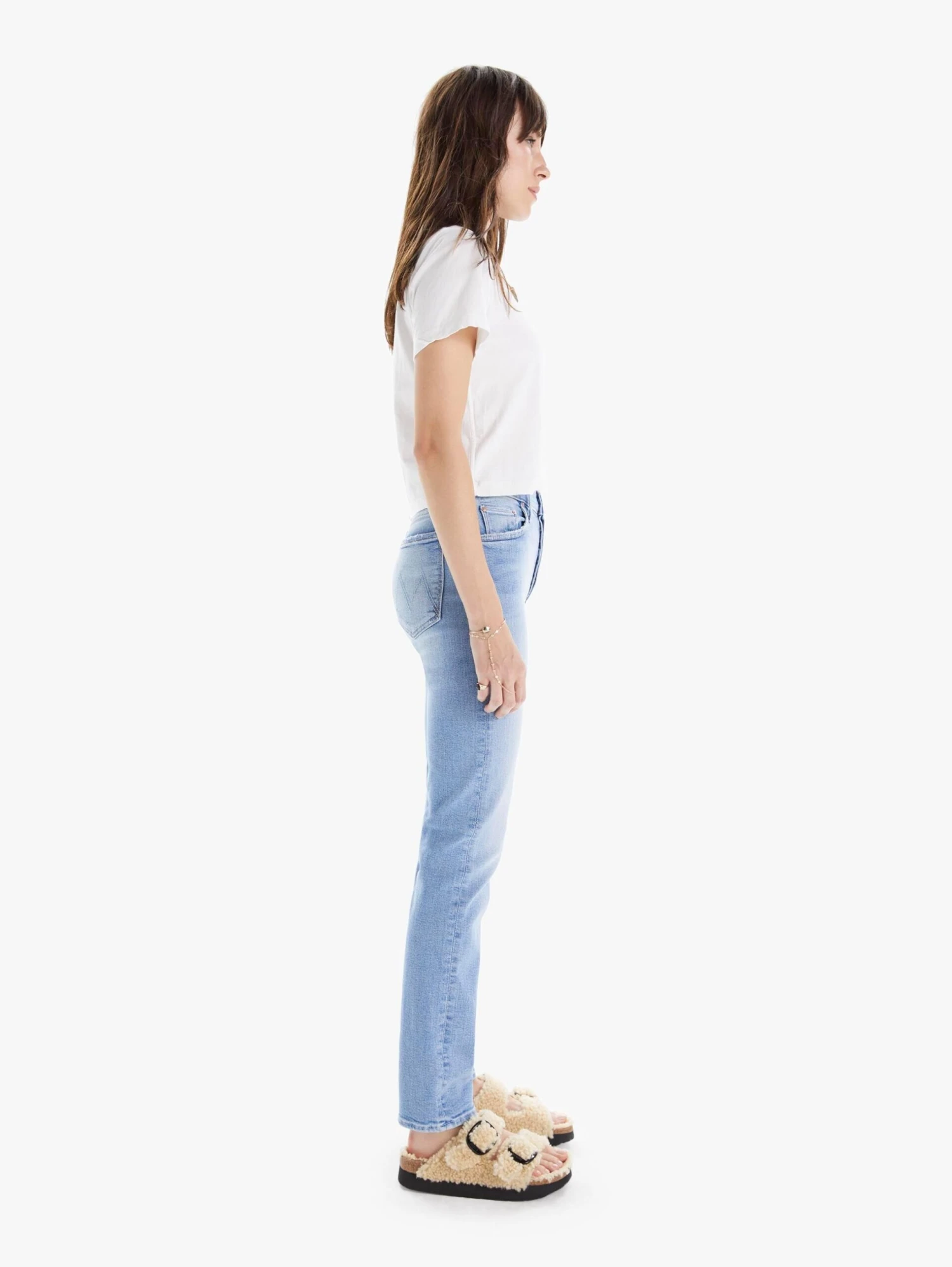 The Mother Denim The Tomcat Skimp in California Cruiser. Our bestselling high-rise straight leg with a button fly, 31-inch inseam and clean hem. Cut from stretch denim, California Cruiser is a light blue wash with fading and whiskering. The button-fly jeans pair well with sun-streaked hair, convertibles and Highway 1.