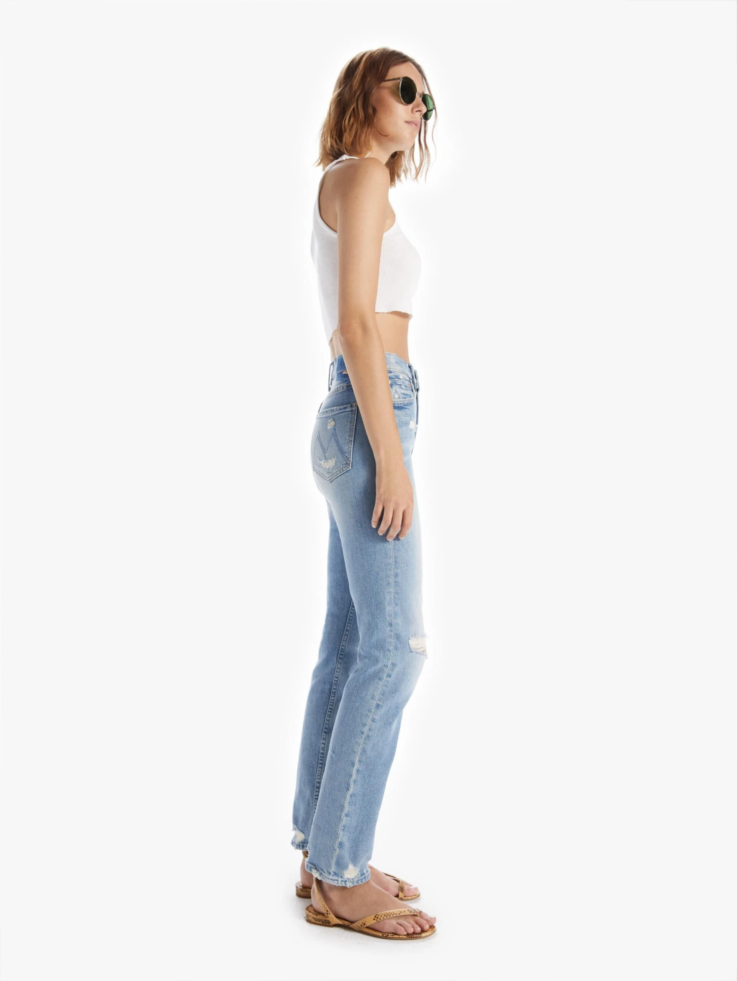 The High Waisted Rider Skim is the perfect high-waisted straight leg denim, having a 31-inch inseam. Made from semi-rigid denim with minimal stretch, these jeans are superior, In a faded blue wash with destroyed details.