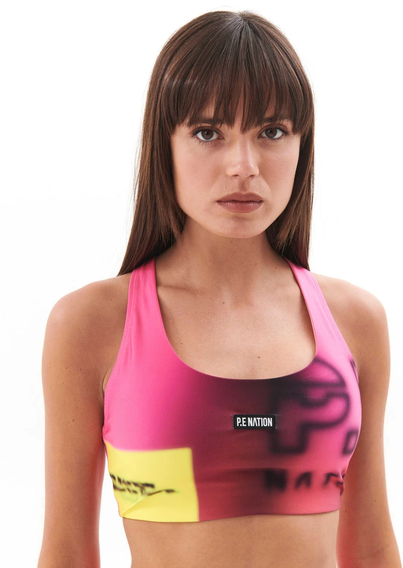 The Immersion Sports Bra in Blur Print by PE Nation comes as part of the brands Ready, Set, Let’s Go Collection, designed to inspire sky high energy, the pursuit of all passions, an appreciation for the power of now and the endless possibilities hidden within present time. An active sports crop with scoop neckline and racerback, the Immersion Sports Bra features all over custom digital blur print in a mix of soft pastels and bold fluro. Made from recycled tech matte fabric, the Immersion has an elasticated under bust to support through low to medium training activities. P.E Nation branded logo patch sits centre front. Team it up with the Immersion Bike Short for a head to toe studio fit.