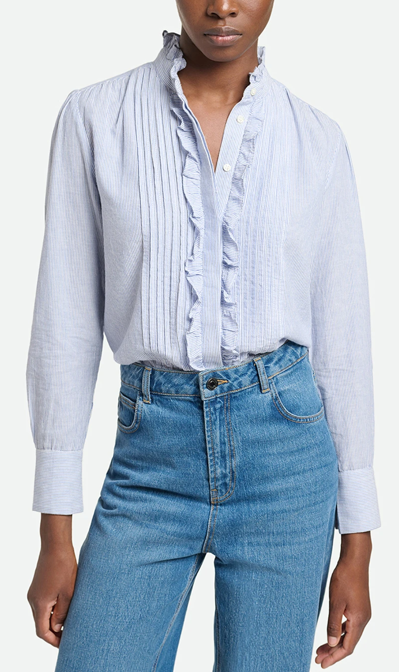 The Vanessa Bruno Nicolas Blouse in White/Blue is a modern spin on a classic. Featuring a ruffled and pleated button up front, with a frilled collar. Pair yours tucked into jeans or tailored pants.